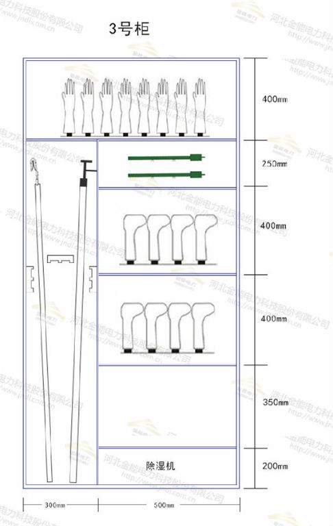 如上圖規(guī)格為2000*800mm,左側(cè)高2000mm,寬200mm存放接地線,右半部分寬600mm,分為4層,其中頂部250mm存放驗電器,下面450mm存放絕緣手套,下面400mm存放絕緣靴,下面700mm可存放令克棒等安全工器具,底部200mm為除濕機。