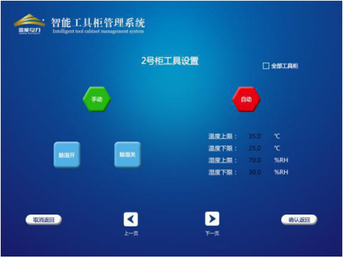 主頁數(shù)據(jù)顯示界面主要顯示的是各個柜子工具信息,包括柜內(nèi)、外溫濕度、工具名稱、配備數(shù)量、距檢天數(shù)、在位數(shù)量、在位情況等信息。編號圖標顯示紅色則表示離位,綠色則表示在位。上下頁按鈕可進行各柜子頁面切換。該界面還配有開門、設(shè)置、查詢界面的按鈕。狀態(tài)一欄有自動、手動兩種狀態(tài),表示的是此號柜中除濕機的工作狀態(tài)。自動狀態(tài)下,當溫、濕度達到設(shè)定的范圍值則除濕機會自動打開或者關(guān)閉。手動狀態(tài)下,可以強制打開或者關(guān)閉除濕機。